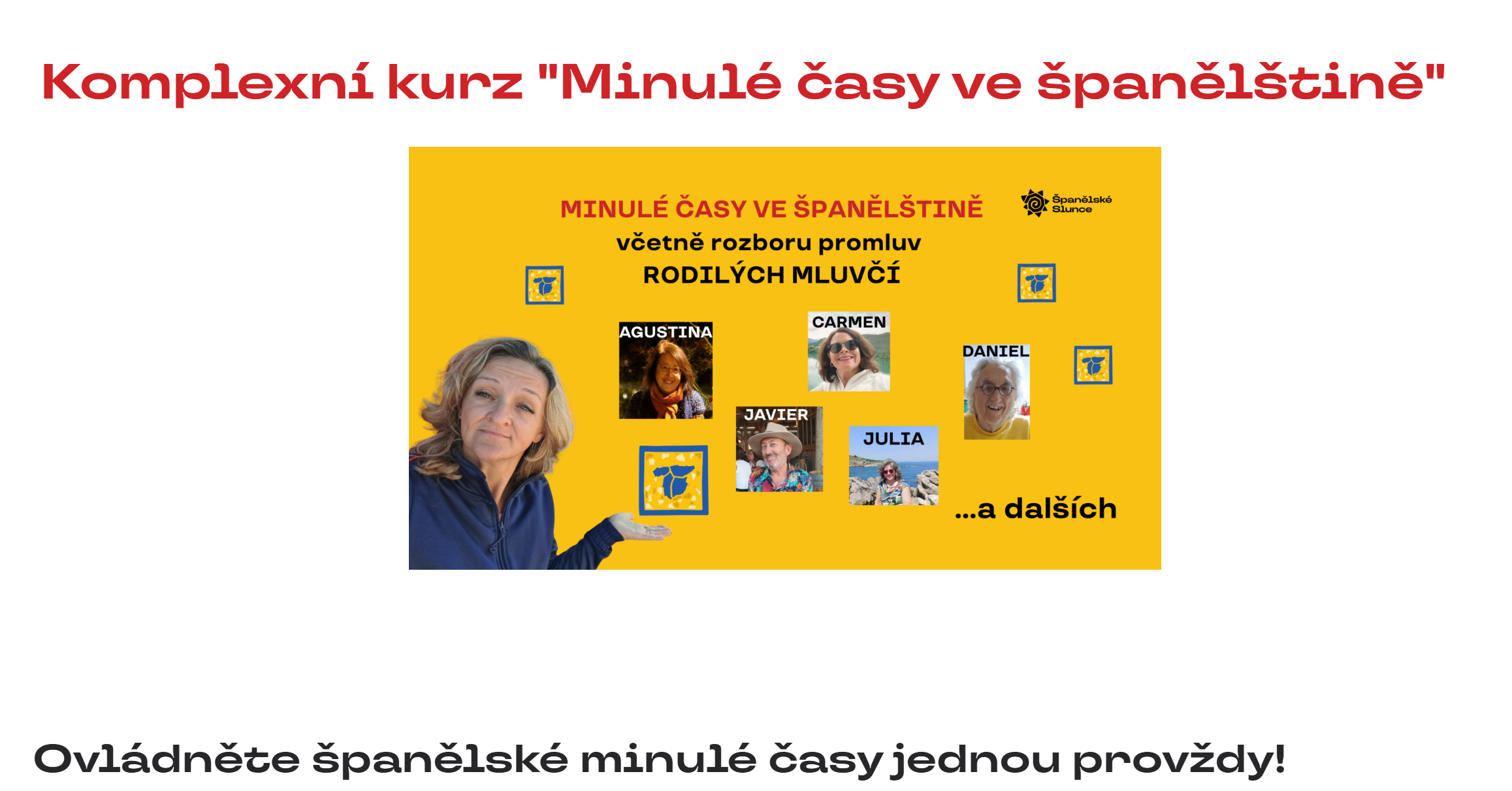 Všemi minulými časy krok za krokem Praktickými cvičeními a reálnými situacemi Tipy, jak si je zapamatovat a neplést si je Konverzační praxí s rodilými mluvčími - rozbory autentických materiálů s výkladem a poukázáním na reálné použití Zaměření se i na to, jak záměna času změní a ovlivní sdělení - někdy Španělé mluvčí změnou času mění obsah zprávy a hodí se to "umět číst"...
